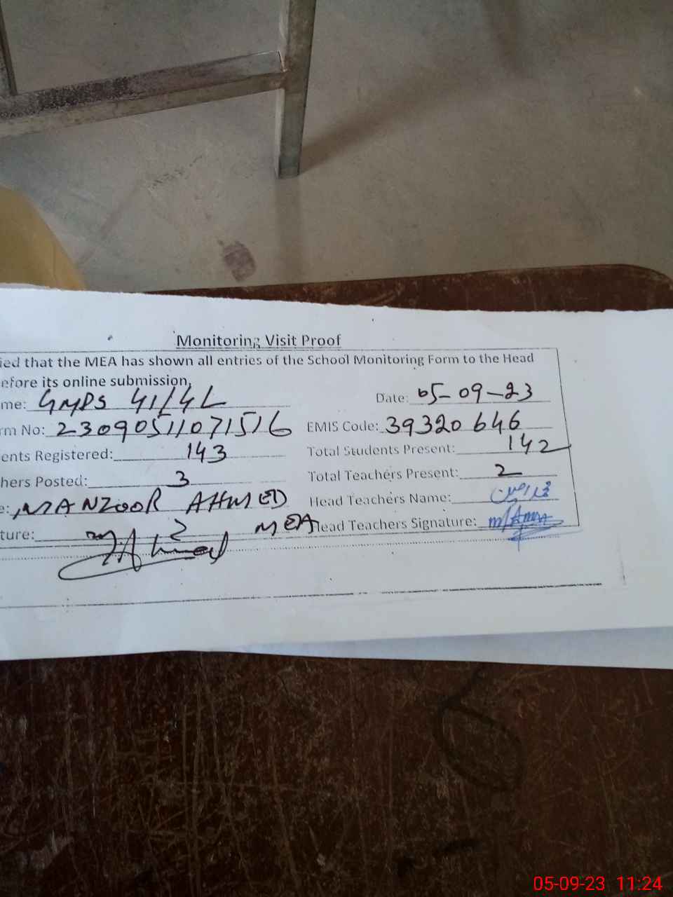 | Attendance Register | Head Teacher | MEA with School | Visit Proof |