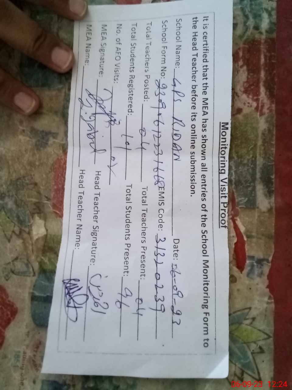| Attendance Register | Head Teacher | MEA with School | Visit Proof |