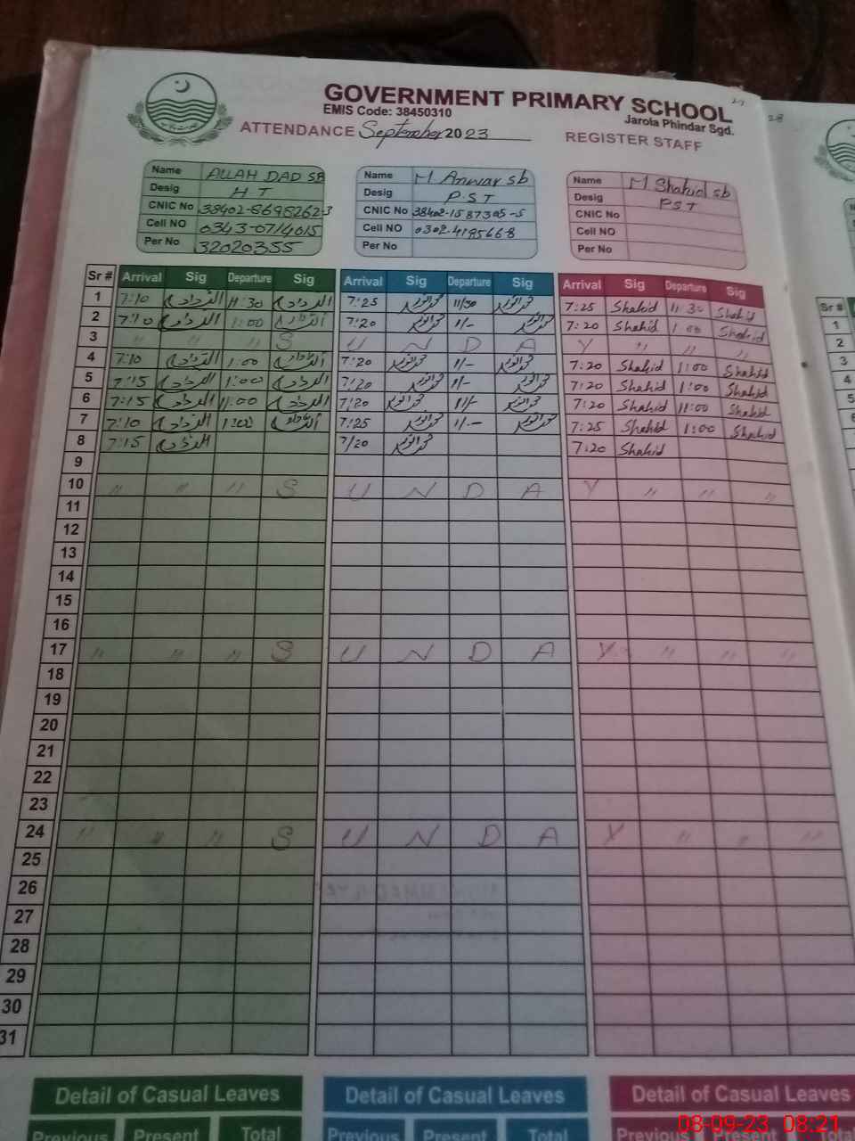 | CNIC | Full Name | Designation | R/C | Absence during last cal. month |