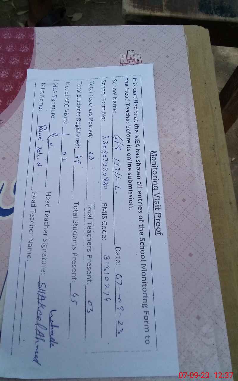 | EMIS Code: 31310274 | Name of School: GPS CHAK NO. 133/1-L | |||