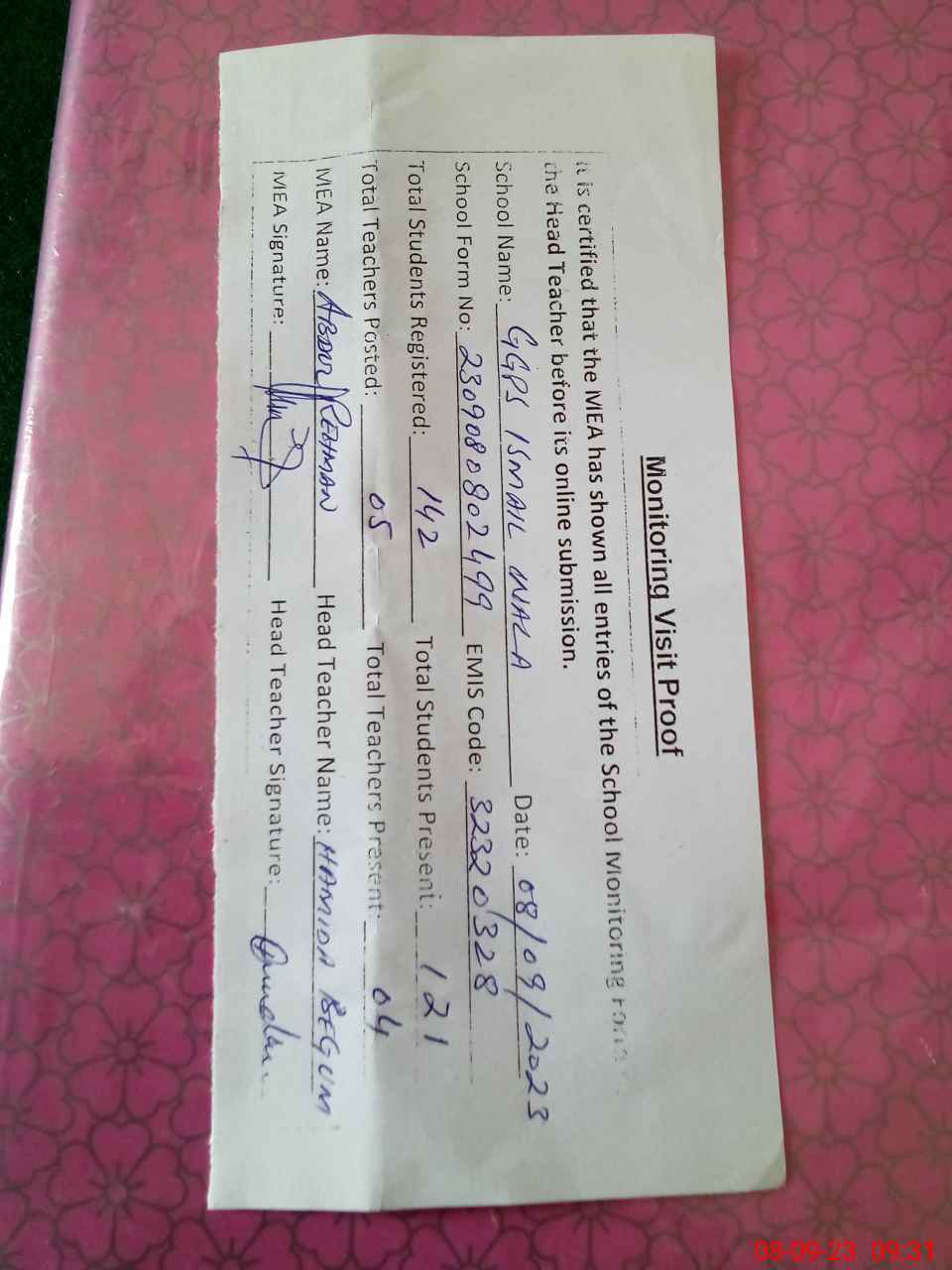 | Attendance Register | Head Teacher | MEA with School | Visit Proof |