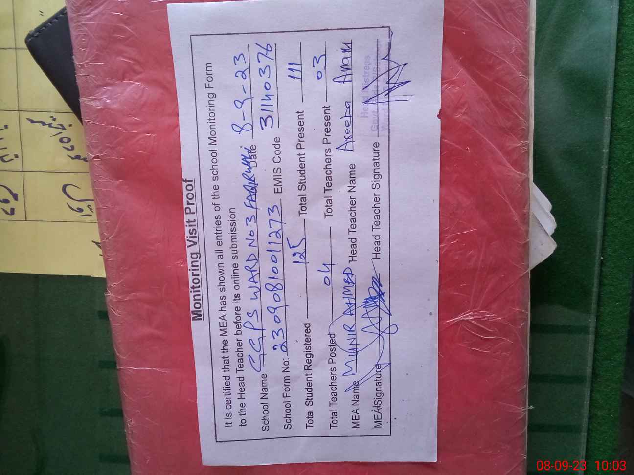 | Attendance Register | Head Teacher | MEA with School | Visit Proof |