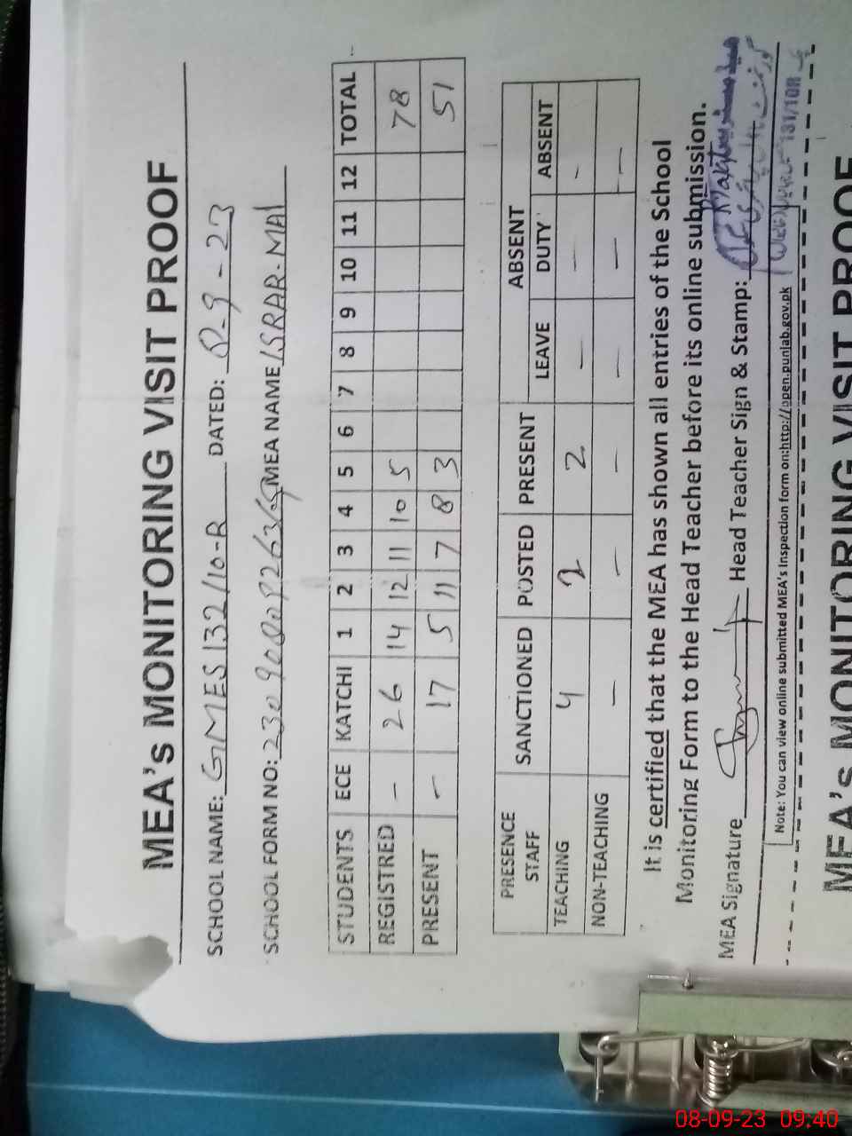 | Attendance Register | Head Teacher | MEA with School | Visit Proof |