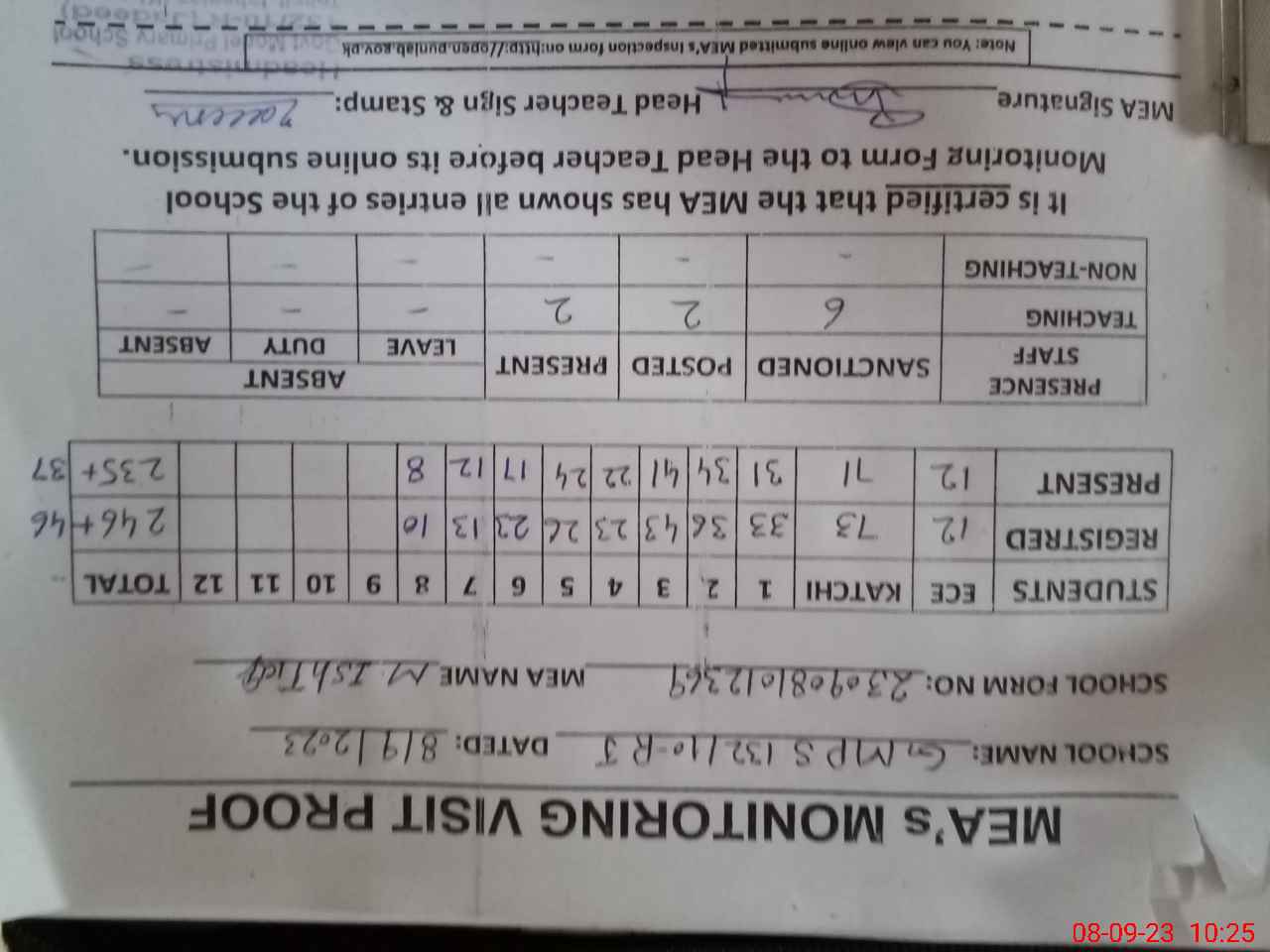 | Attendance Register | Head Teacher | MEA with School | Visit Proof |