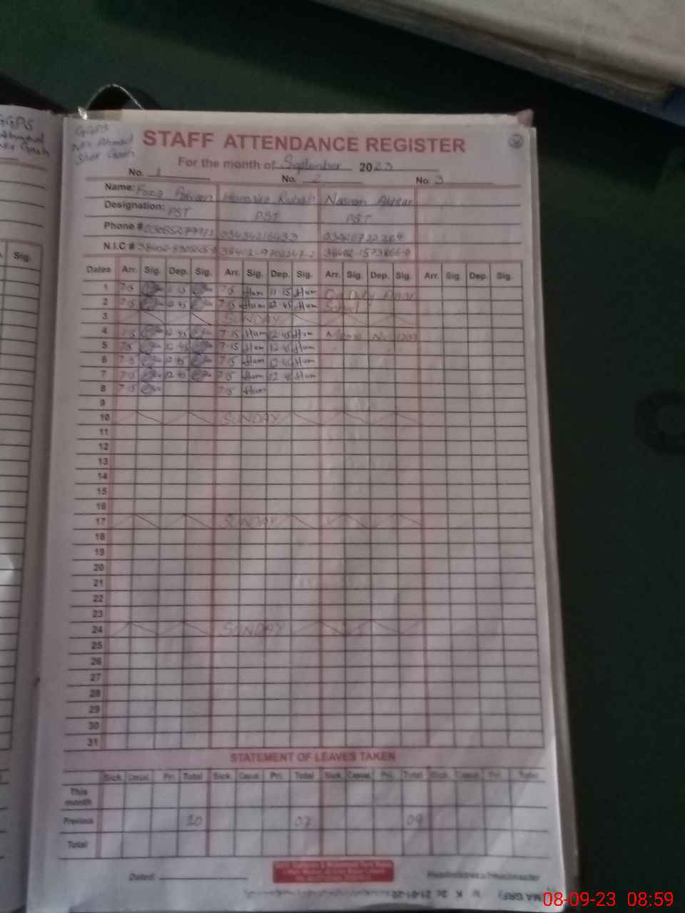 | CNIC | Full Name | Designation | R/C | Absence During Last Calender Month |