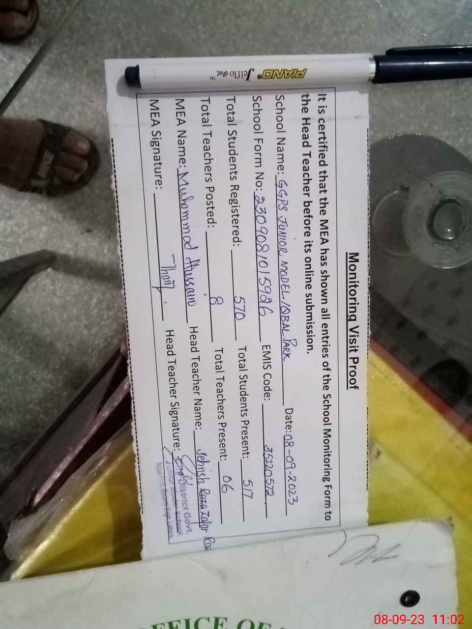 | Attendance Register | Head Teacher | MEA with School | Visit Proof |