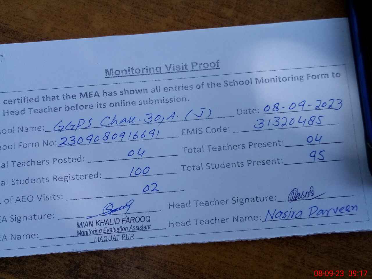 | Attendance Register | Head Teacher | MEA with School | Visit Proof |