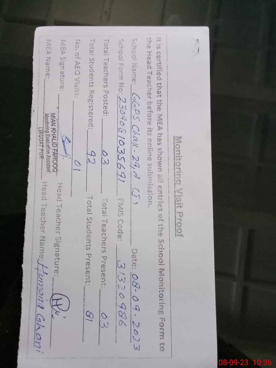 | Attendance Register | Head Teacher | MEA with School | Visit Proof |