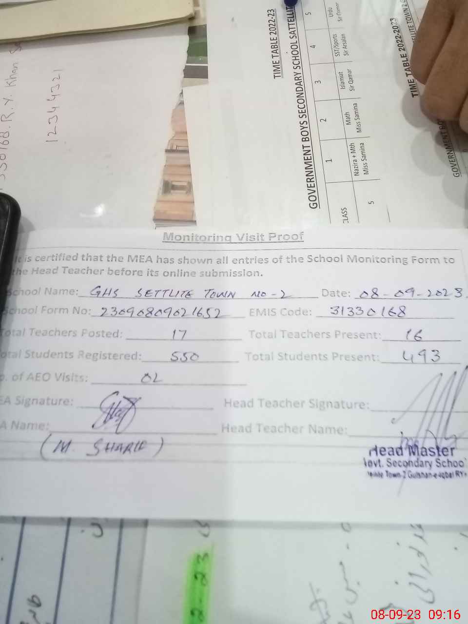 | Attendance Register | Head Teacher | MEA with School | Visit Proof |