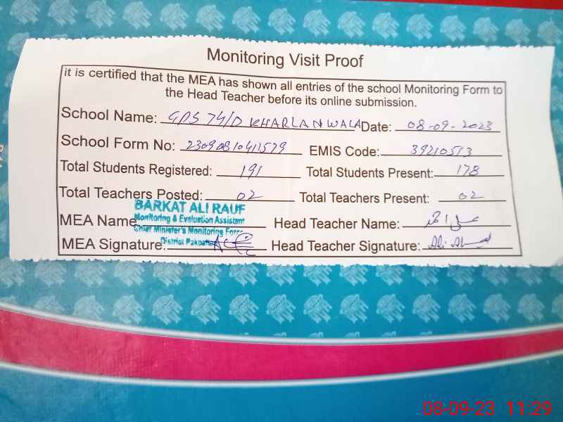 | EMIS Code: 39210513 | Name of School: GPS CHAK NO.74 D KHARLAN WALA | |||