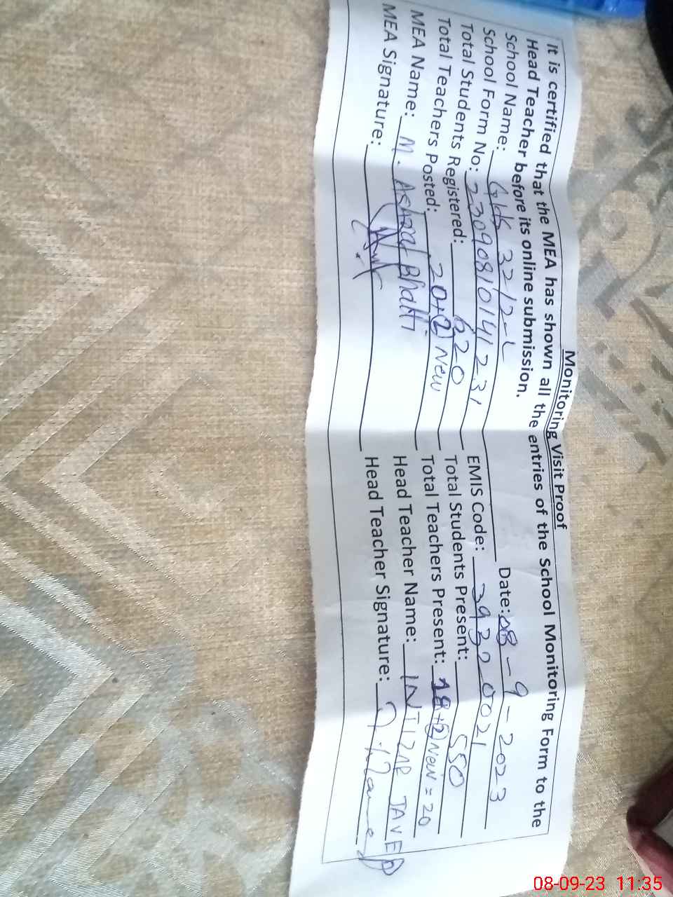 | Attendance Register | Head Teacher | MEA with School | Visit Proof |