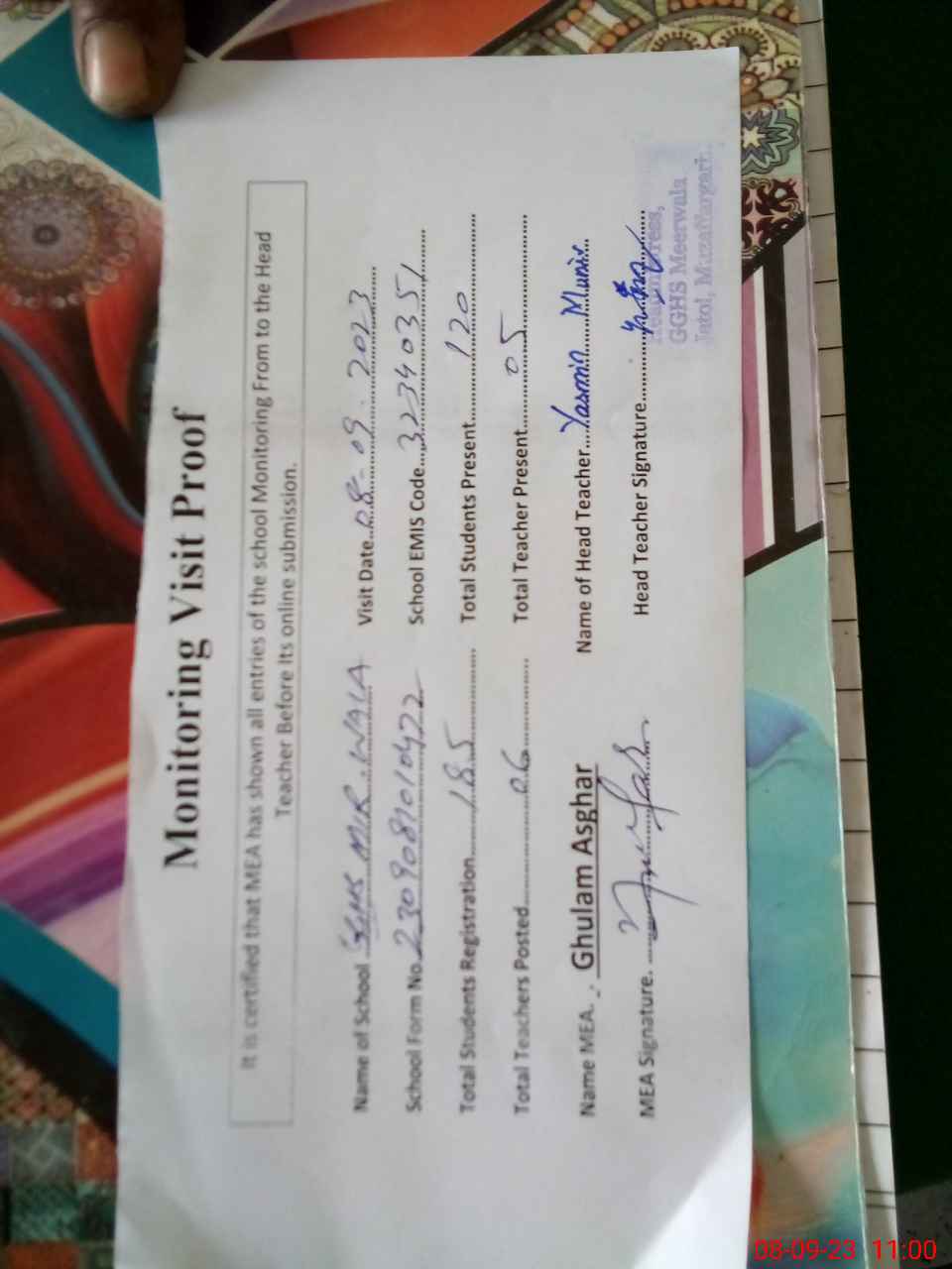 | Attendance Register | Head Teacher | MEA with School | Visit Proof |