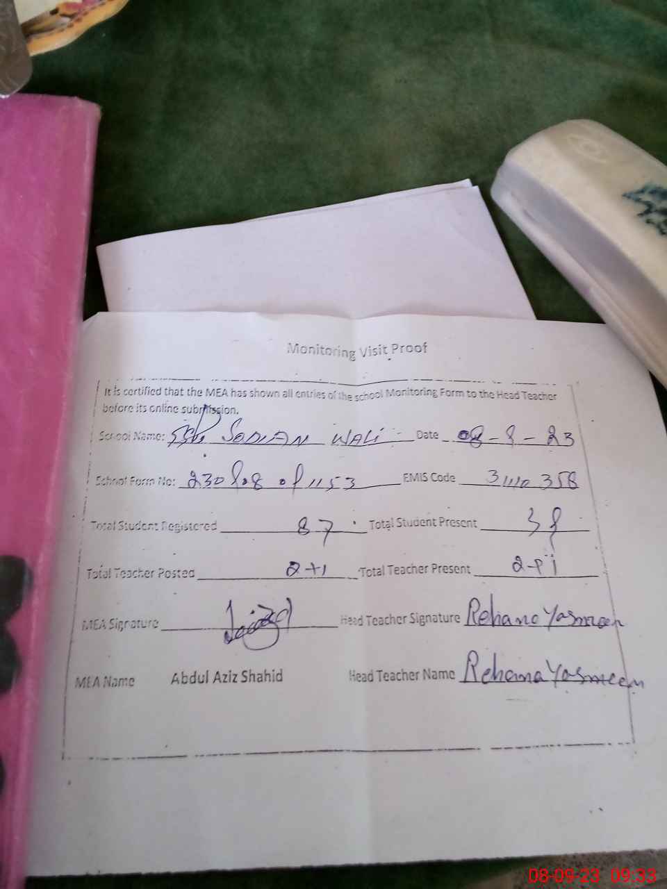 | Attendance Register | Head Teacher | MEA with School | Visit Proof |