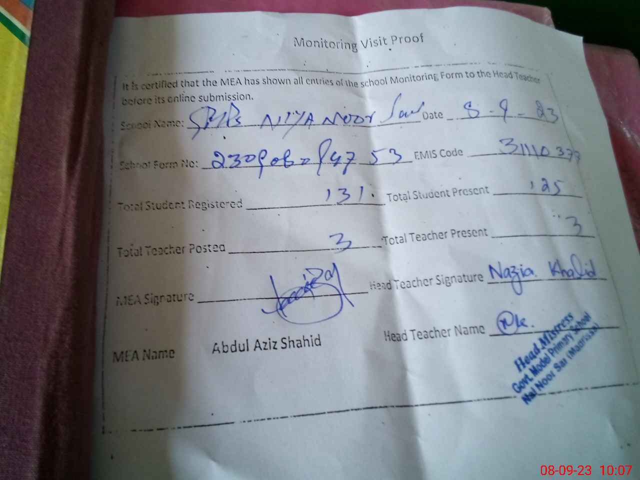| Attendance Register | Head Teacher | MEA with School | Visit Proof |