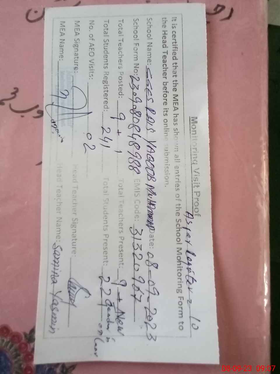 | Attendance Register | Head Teacher | MEA with School | Visit Proof |