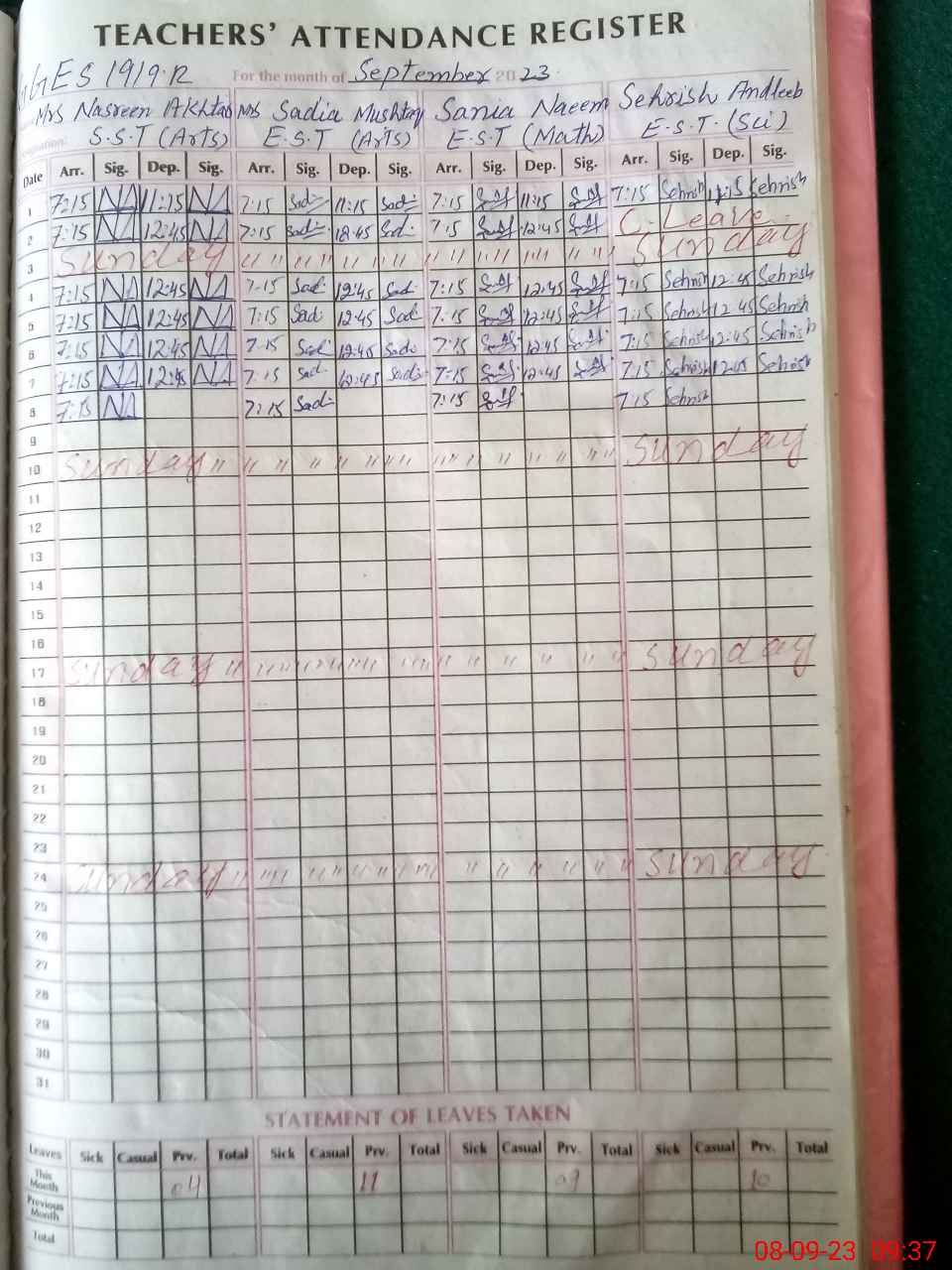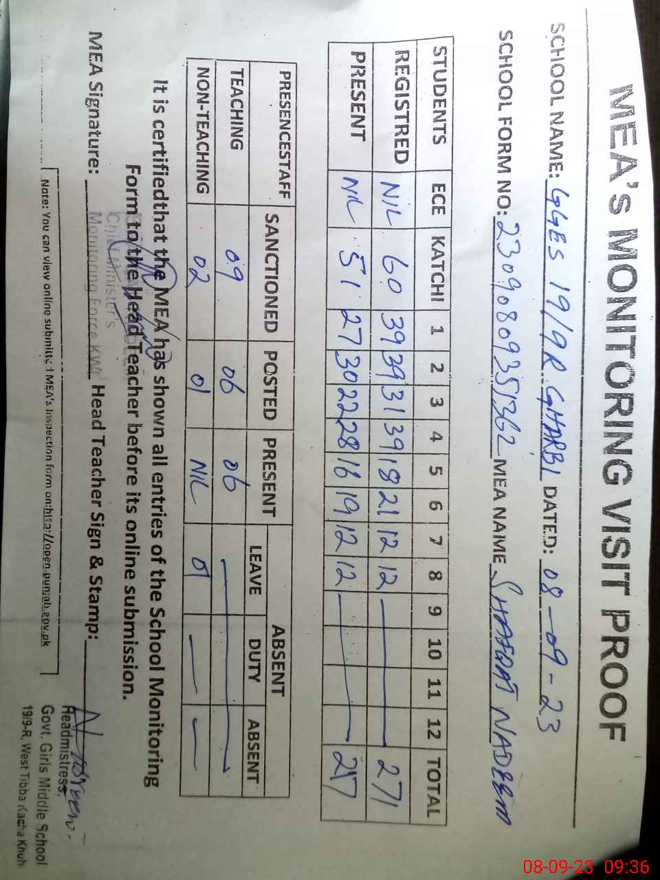 | Attendance Register | Head Teacher | MEA with School | Visit Proof |