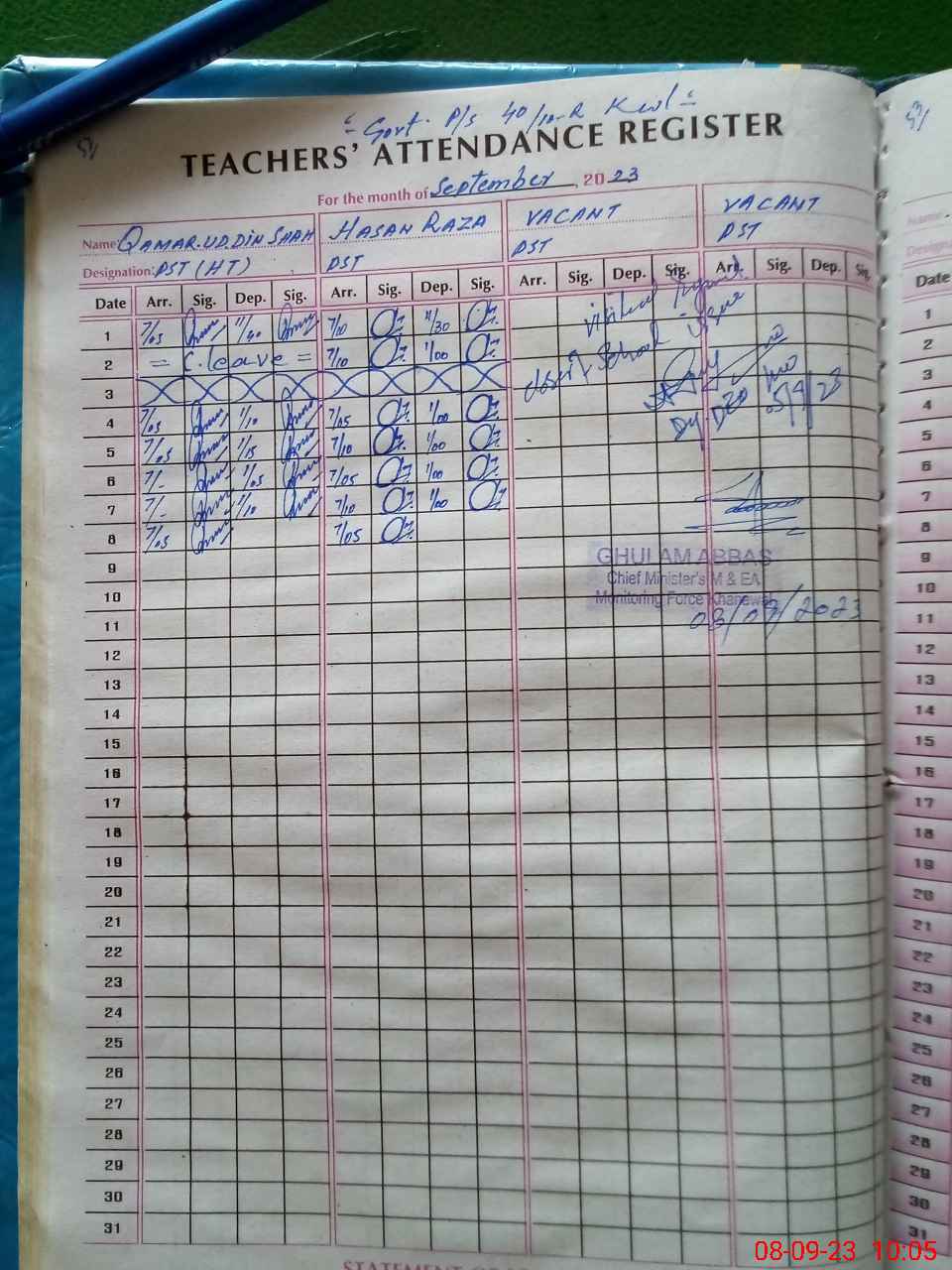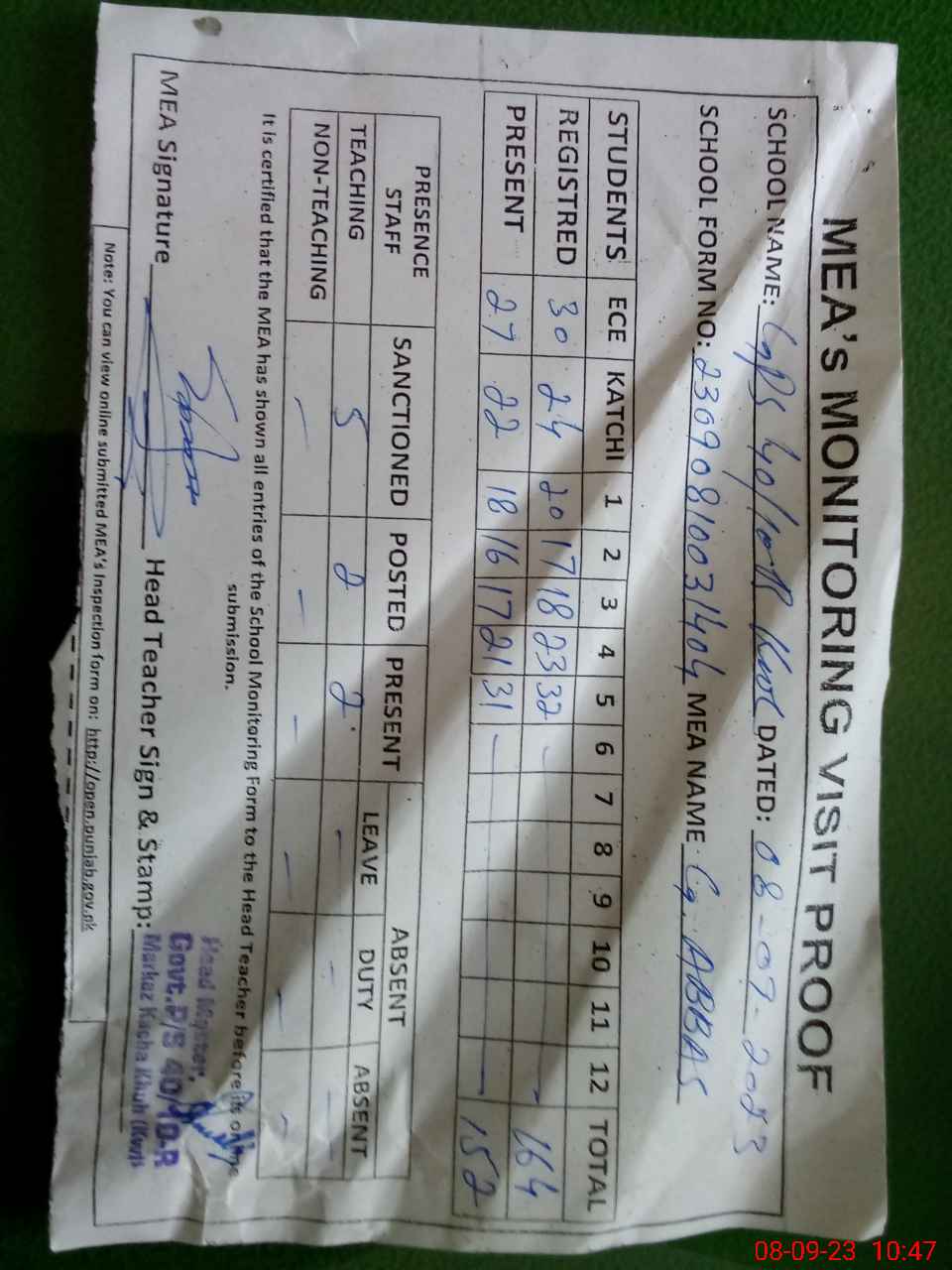 | Attendance Register | Head Teacher | MEA with School | Visit Proof |