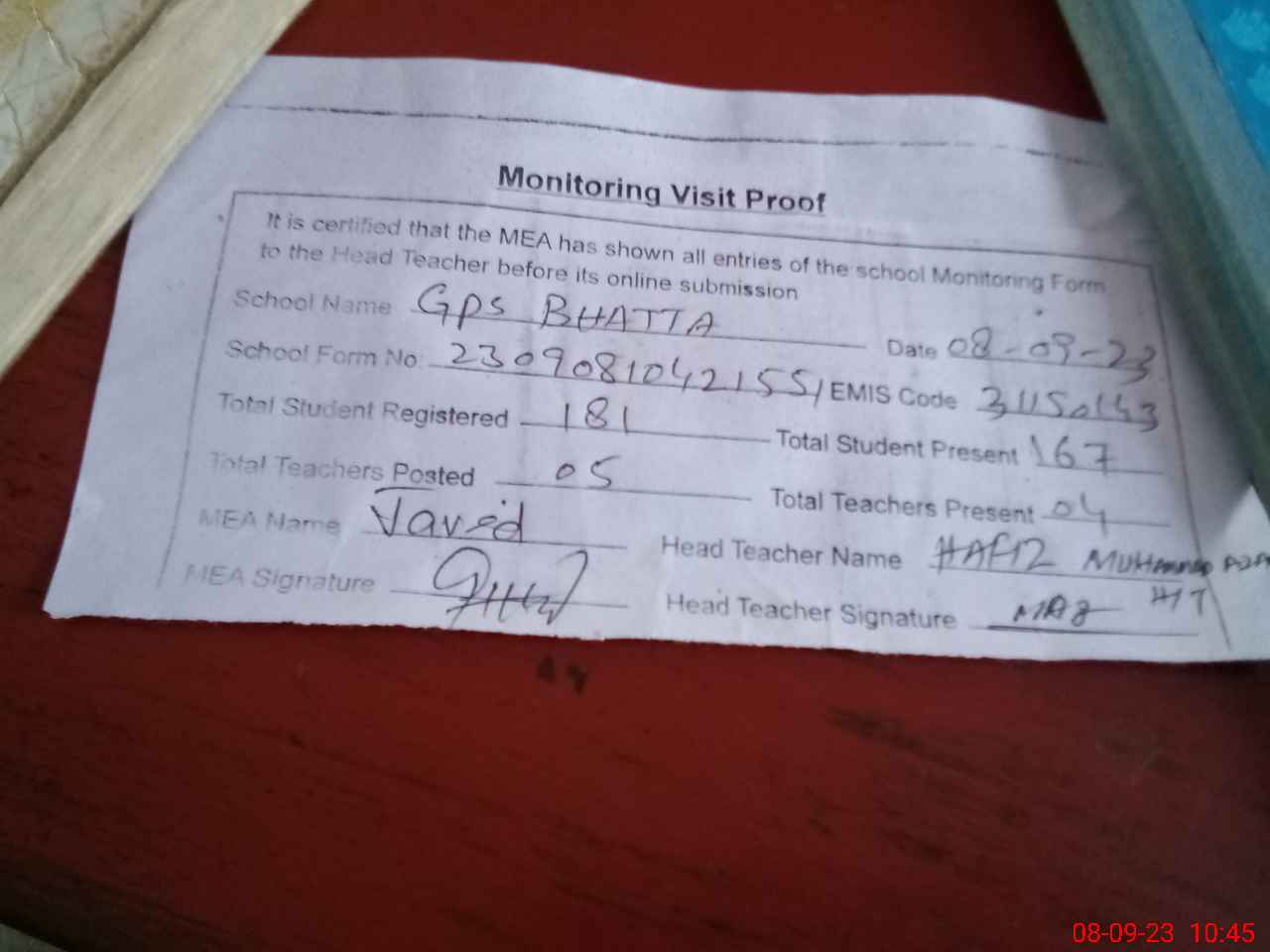 | EMIS Code: 31150143 | Name of School: GPS BHATTA | |||