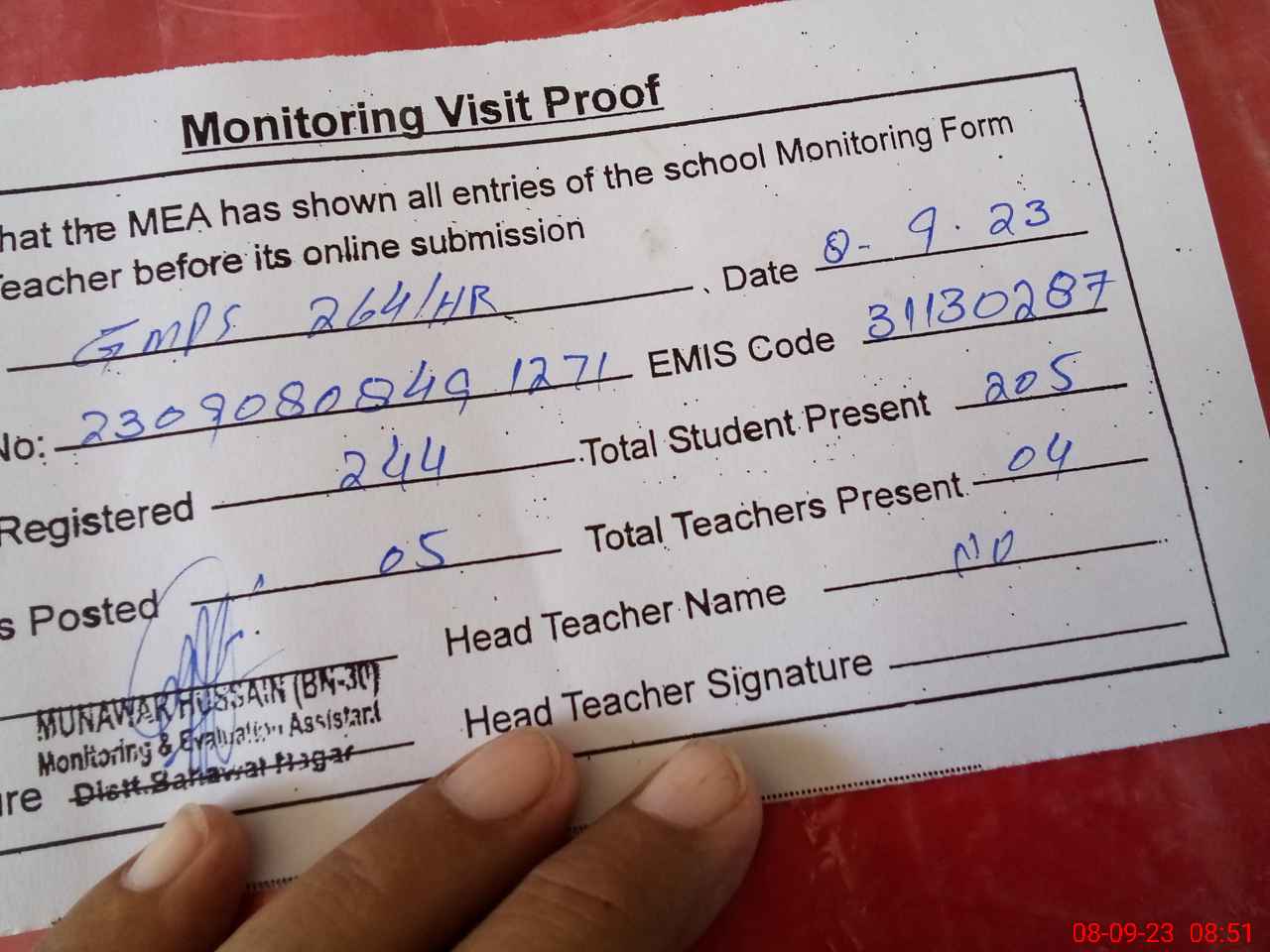 | Attendance Register | Head Teacher | MEA with School | Visit Proof |