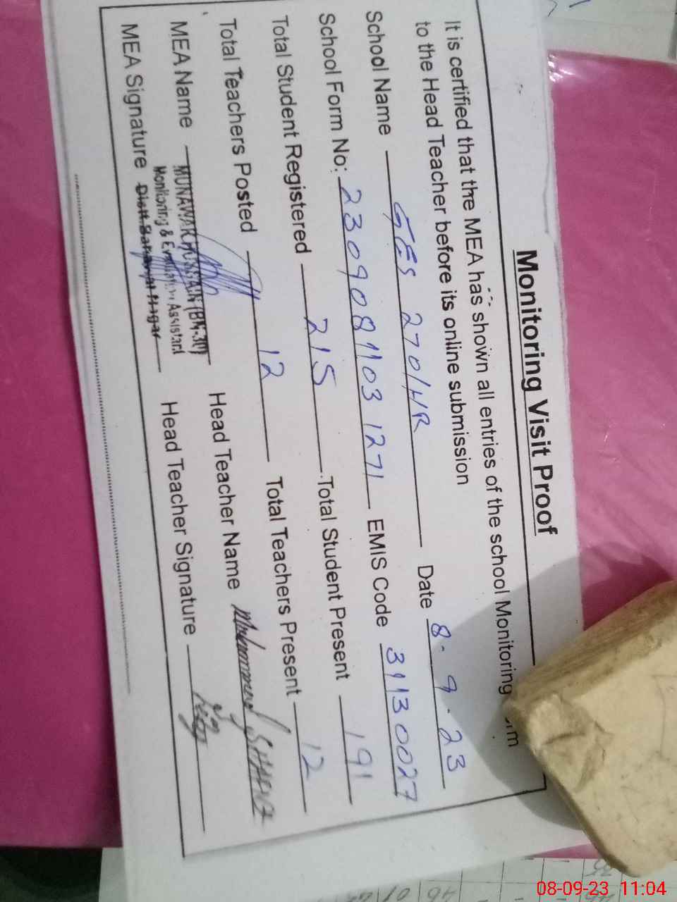 | Attendance Register | Head Teacher | MEA with School | Visit Proof |