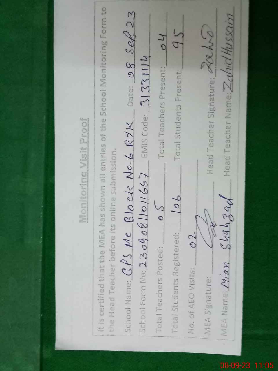| Attendance Register | Head Teacher | MEA with School | Visit Proof |