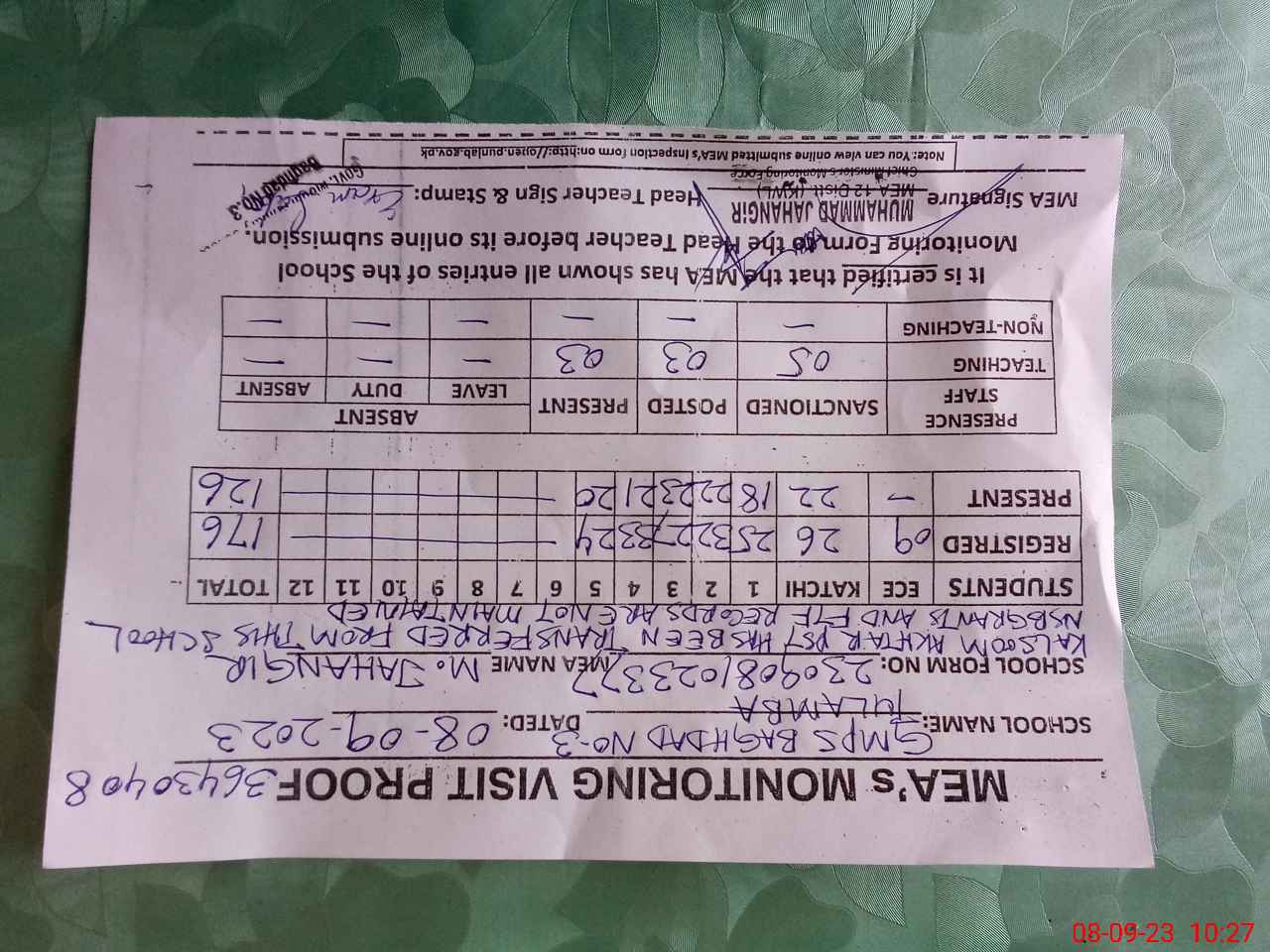 | Monitoring Date: 08-09-2023 | Start Time: 08-09-2023 08:30 AM | End Time: 08-09-2023 10:30 AM | Name of MEA: Mu**** Ja**** | |