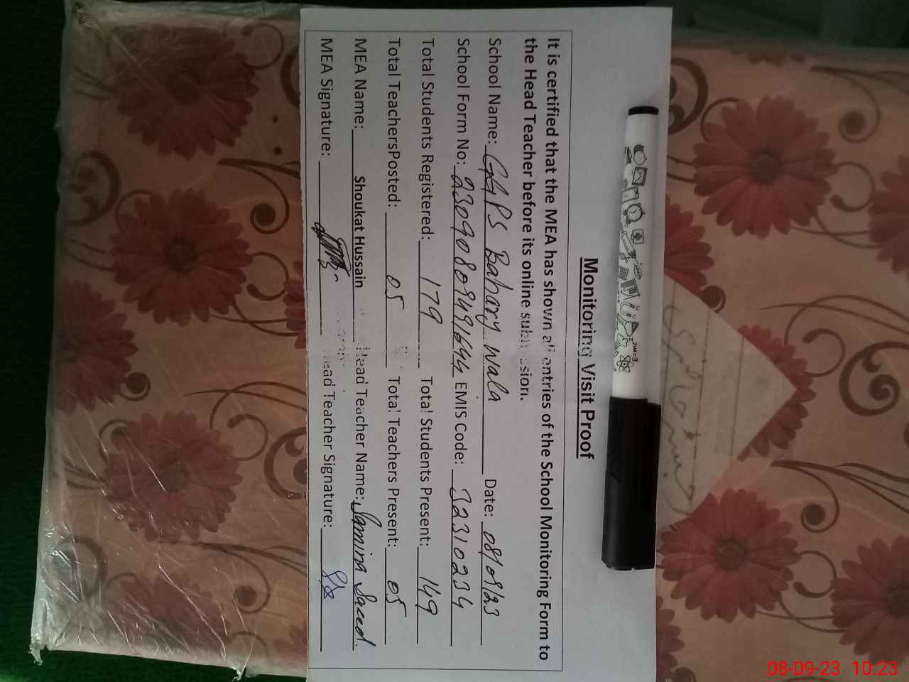 | Attendance Register | Head Teacher | MEA with School | Visit Proof |