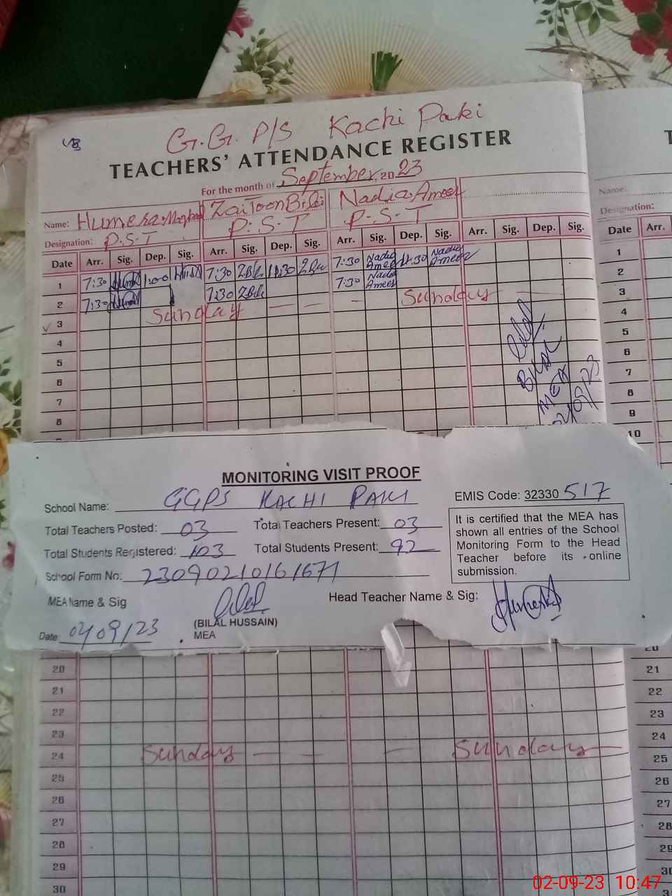 | Attendance Register | Head Teacher | MEA with School | Visit Proof |