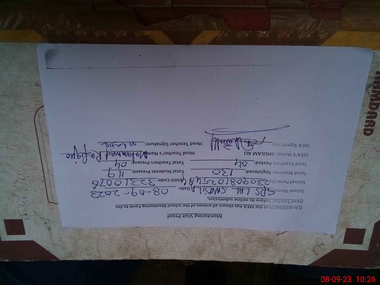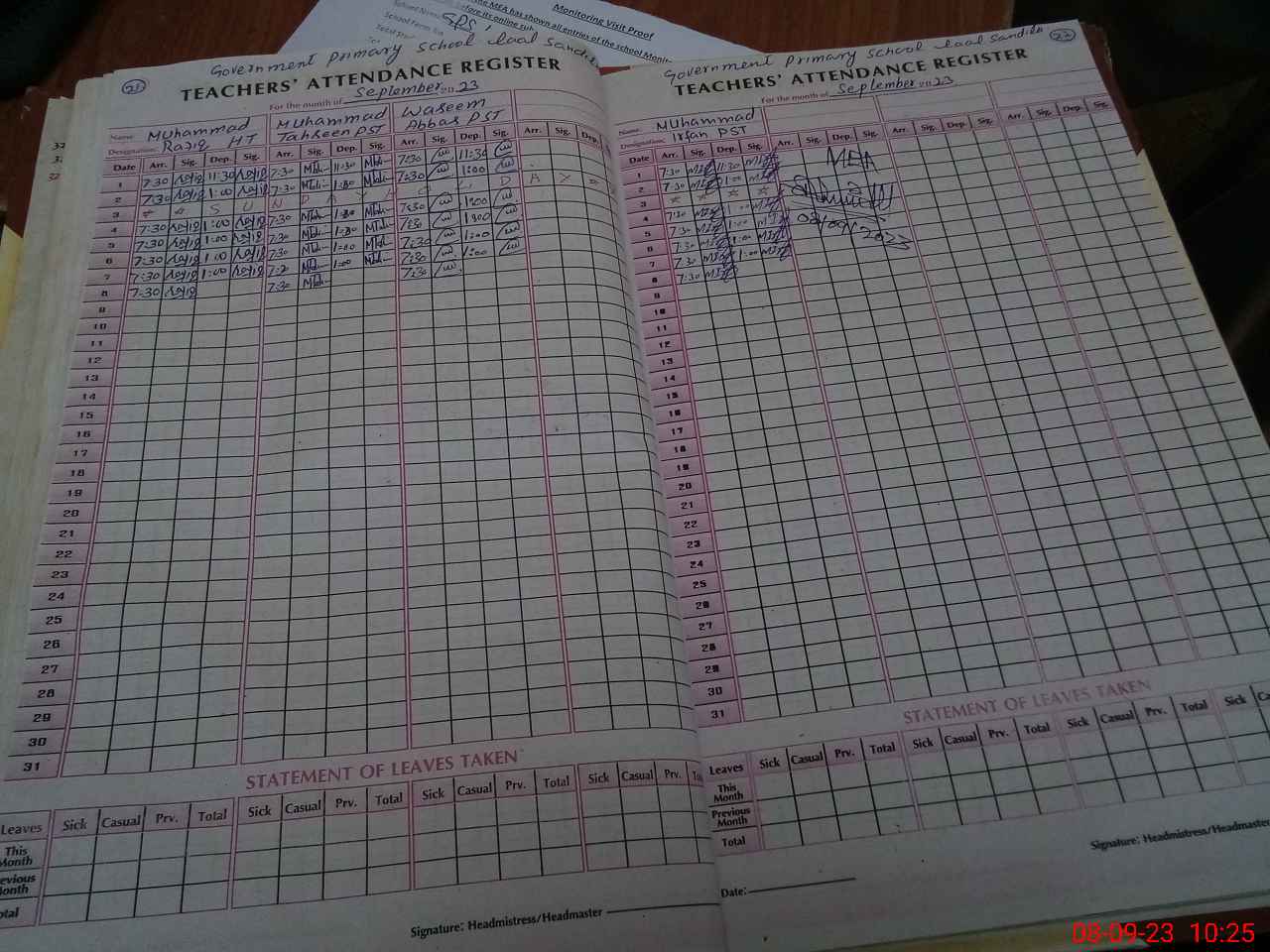 | Attendance Register | Head Teacher | MEA with School | Visit Proof |