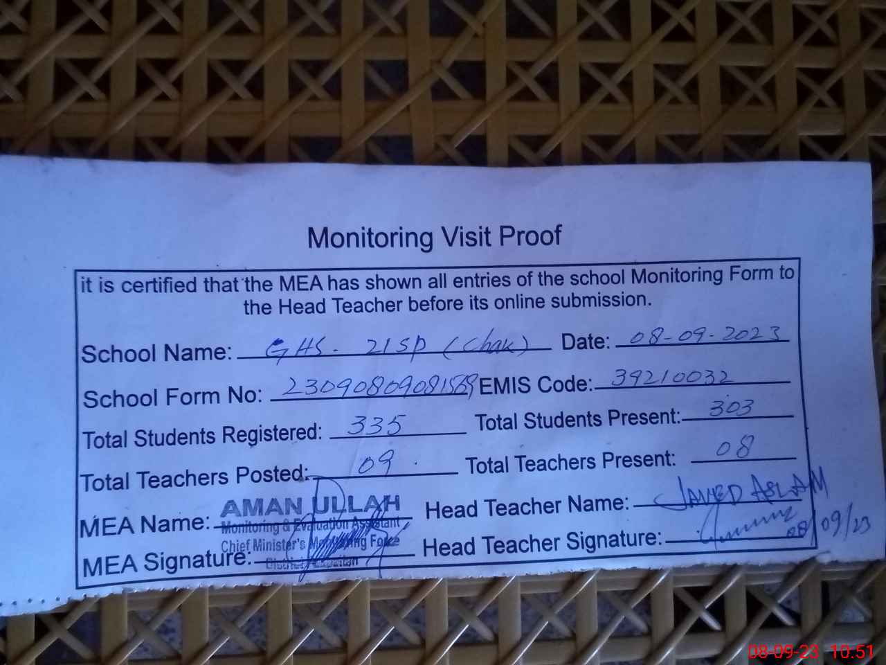 | Certified that this School was Inspected by the Undersigned MEA/DMO Today and the Information Stated Above is as Per Record. | |||||
