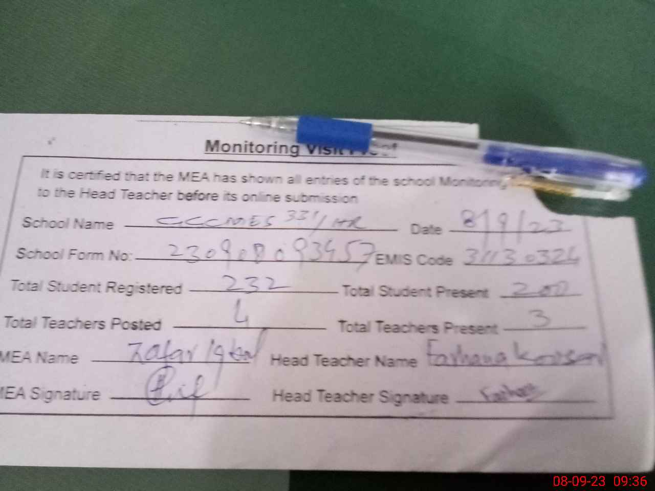 | Attendance Register | Head Teacher | MEA with School | Visit Proof |