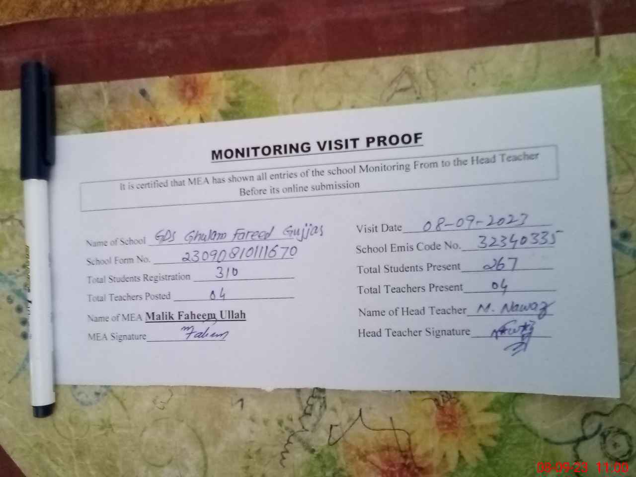 | Attendance Register | Head Teacher | MEA with School | Visit Proof |