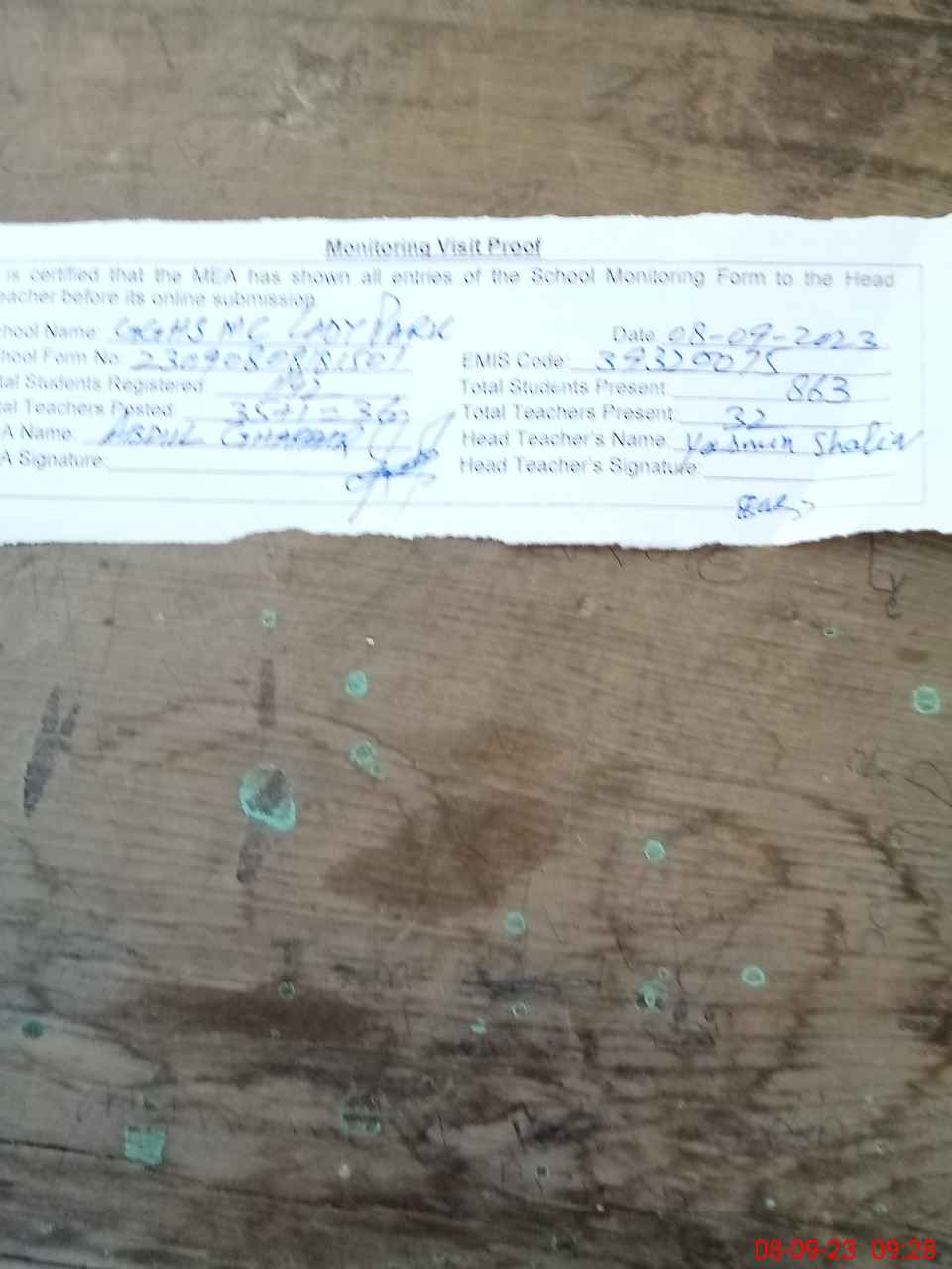 | Attendance Register | Head Teacher | MEA with School | Visit Proof |