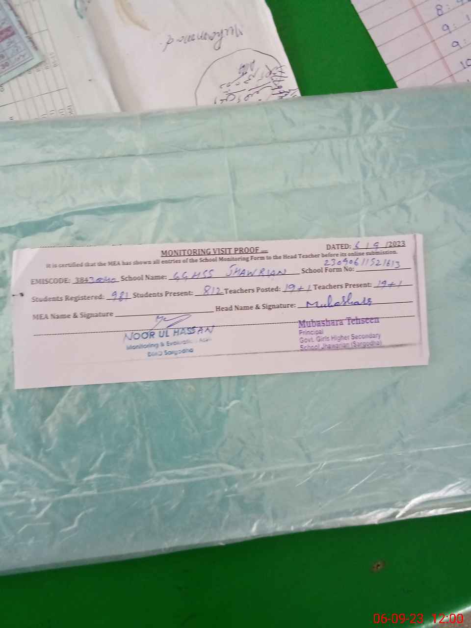 | Attendance Register | Head Teacher | MEA with School | Visit Proof |