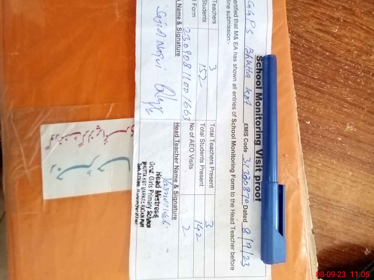 | Attendance Register | Head Teacher | MEA with School | Visit Proof |