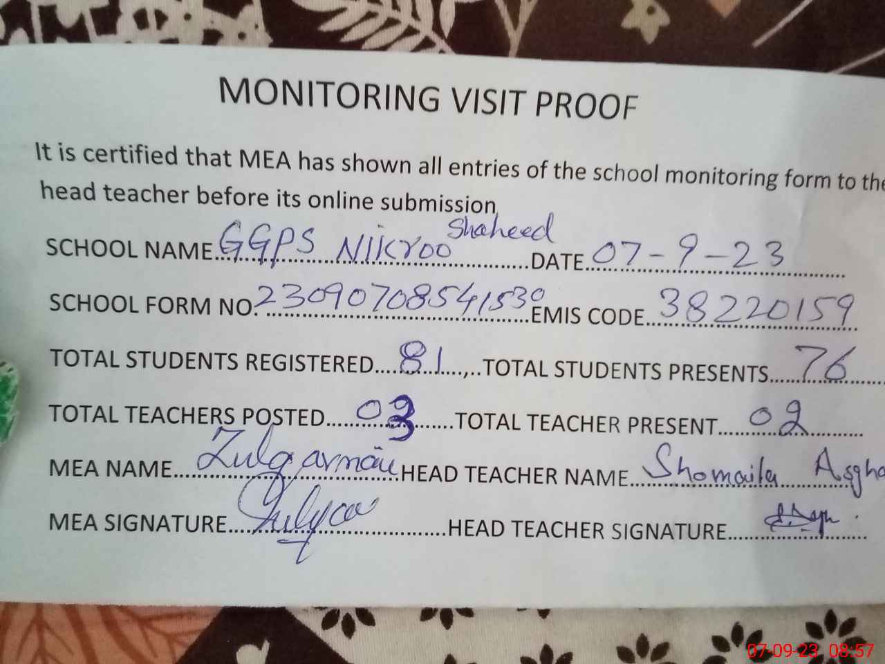 | Attendance Register | Head Teacher | MEA with School | Visit Proof |