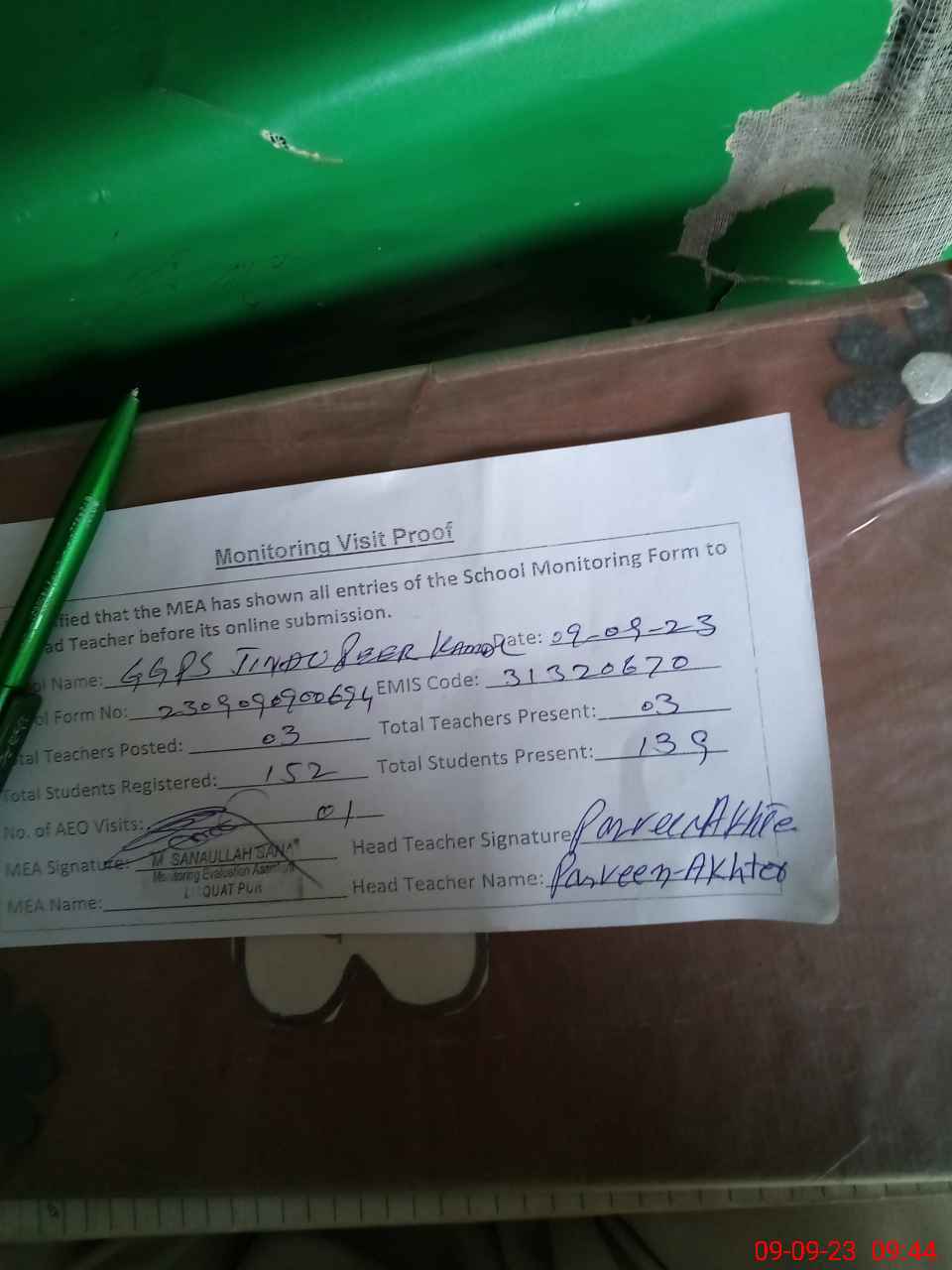 | Monitoring Date: 09-09-2023 | Start Time: 09-09-2023 09:00 AM | End Time: 09-09-2023 09:45 AM | Name of MEA: Mu**** Sa**** Ul**** Sa**** | |