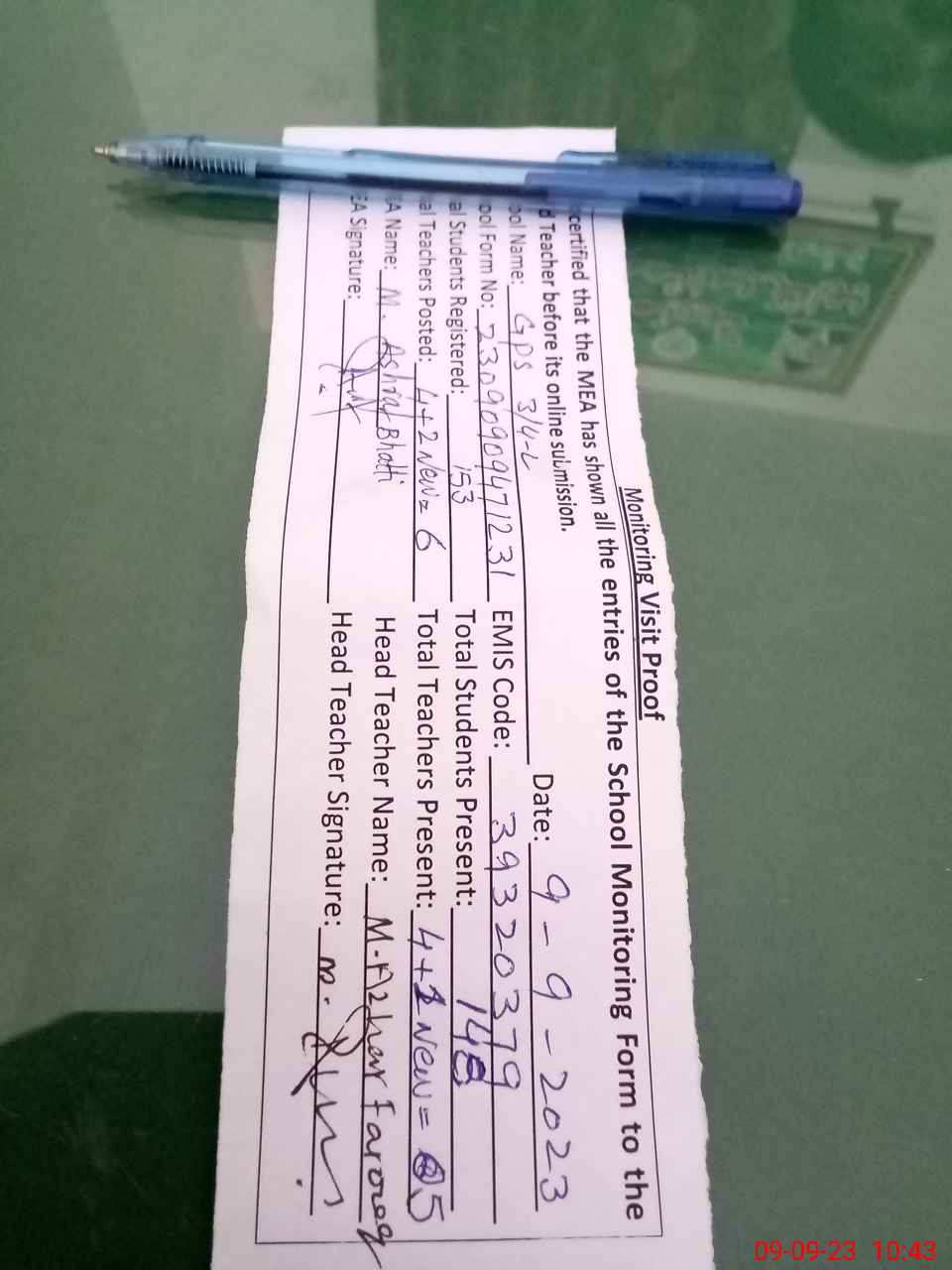 | Attendance Register | Head Teacher | MEA with School | Visit Proof |