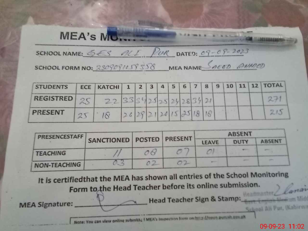 | Attendance Register | Head Teacher | MEA with School | Visit Proof |