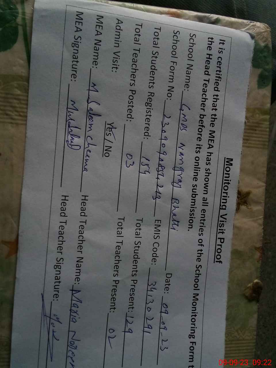 | Attendance Register | Head Teacher | MEA with School | Visit Proof |