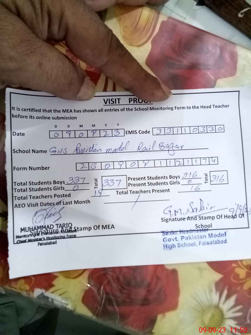 | EMIS Code: 33110330 | Name of School: GHS PAK MODEL RAIL BAZAR FSD | |||
