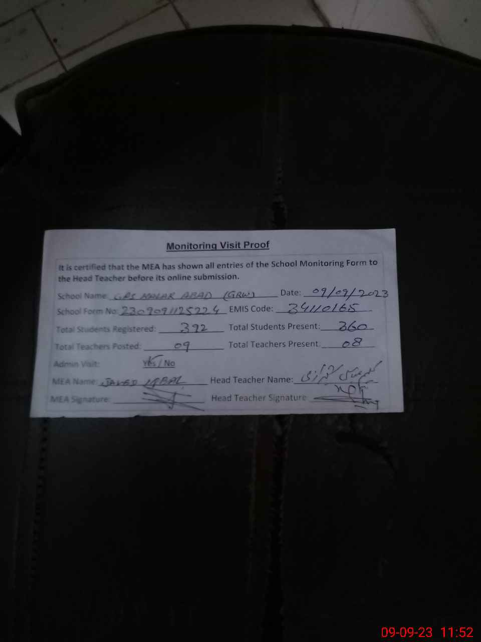 | Attendance Register | Head Teacher | MEA with School | Visit Proof |