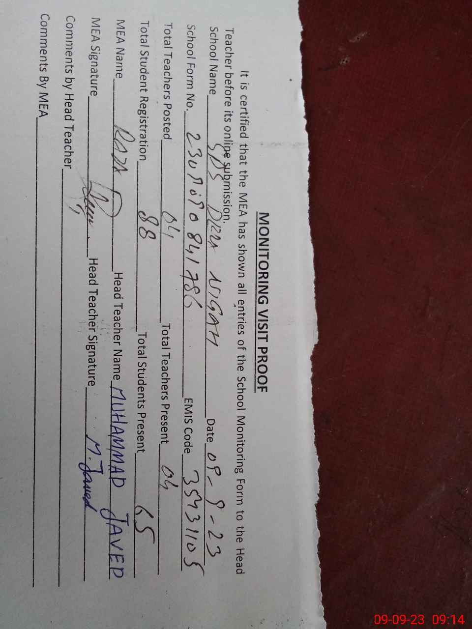 | Attendance Register | Head Teacher | MEA with School | Visit Proof |