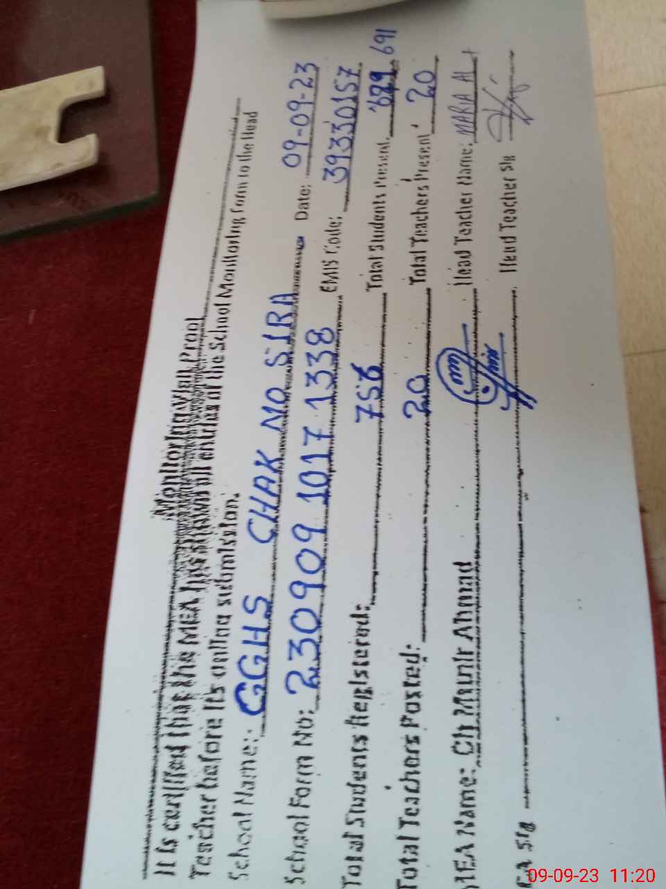 | Attendance Register | Head Teacher | MEA with School | Visit Proof |