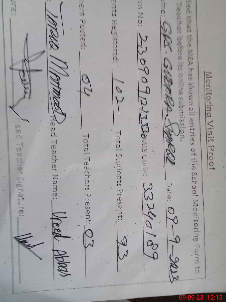 | Attendance Register | Head Teacher | MEA with School | Visit Proof |