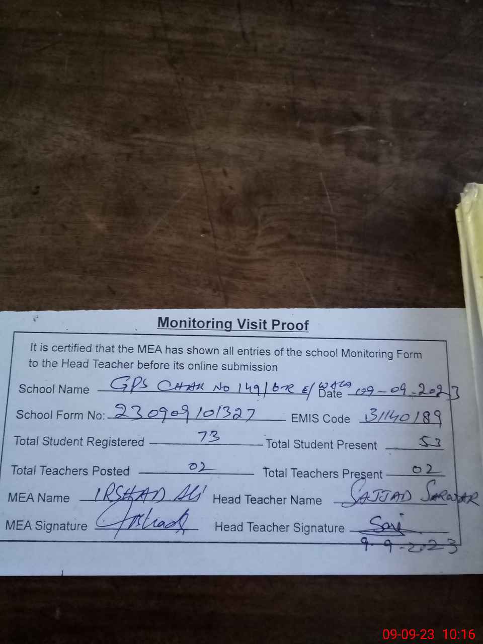 | Attendance Register | Head Teacher | MEA with School | Visit Proof |
