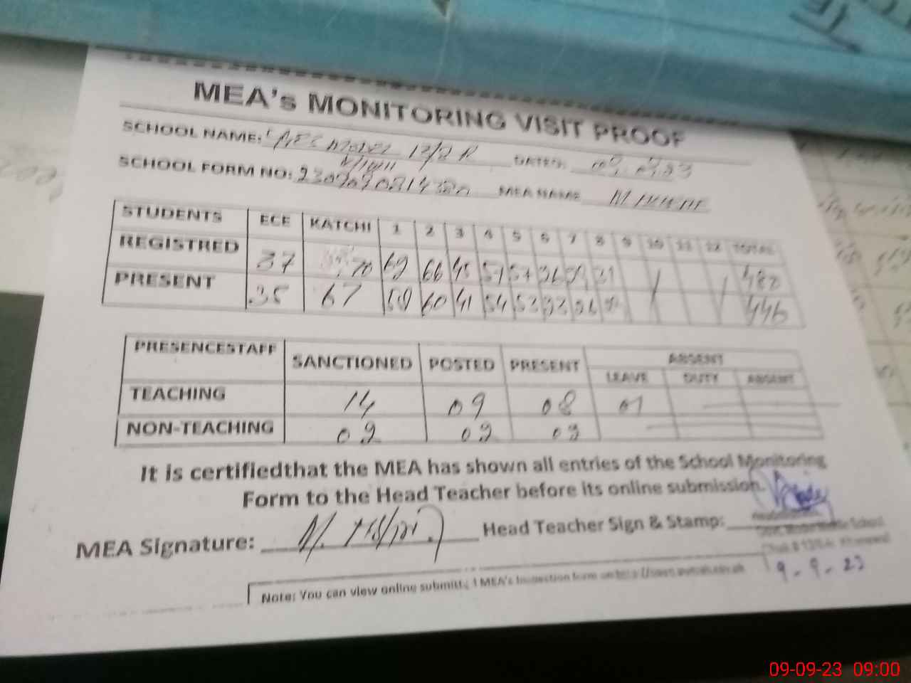 | Attendance Register | Head Teacher | MEA with School | Visit Proof |