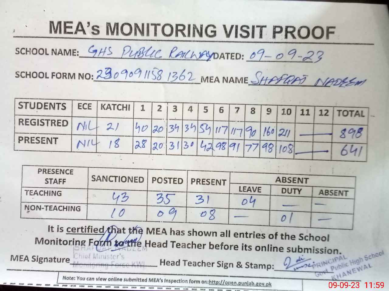 | EMIS Code: 36420004 | Name of School: GHS PUBLIC RAILWAY ROAD, KHANEWAL | |||