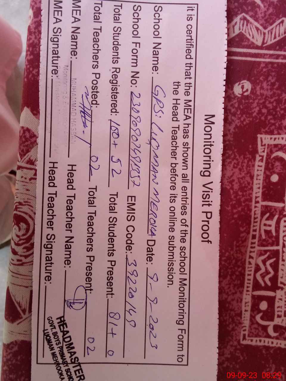 | EMIS Code: 39220149 | Name of School: GPS LUQMAN MEHRO KA | |||