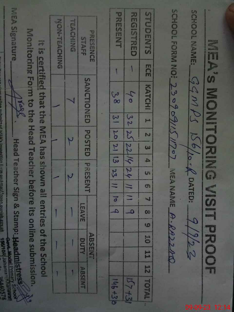 | Attendance Register | Head Teacher | MEA with School | Visit Proof |